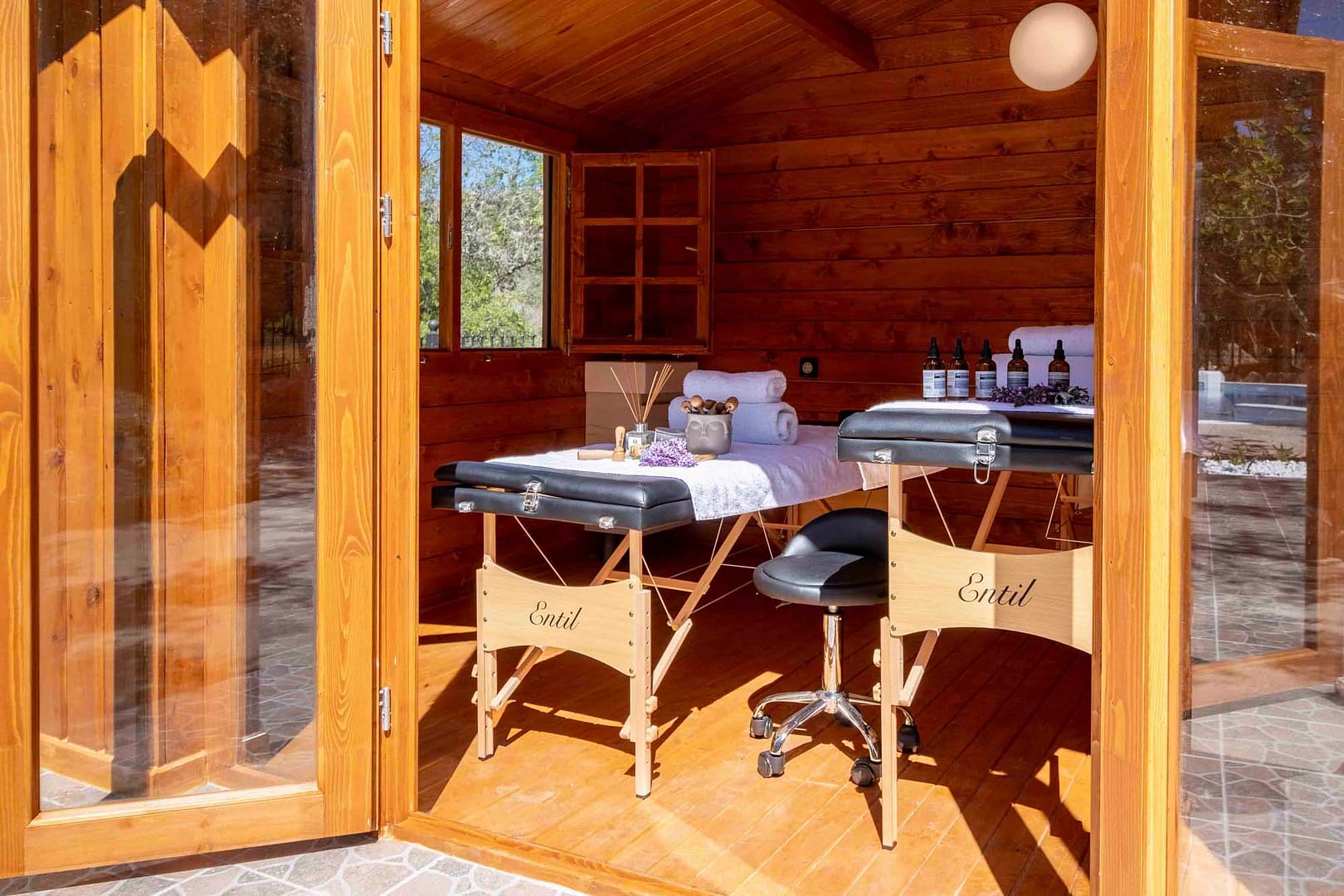 Inside, you’ll find only what’s necessary: 2 comfortable massage tables & fresh linens.