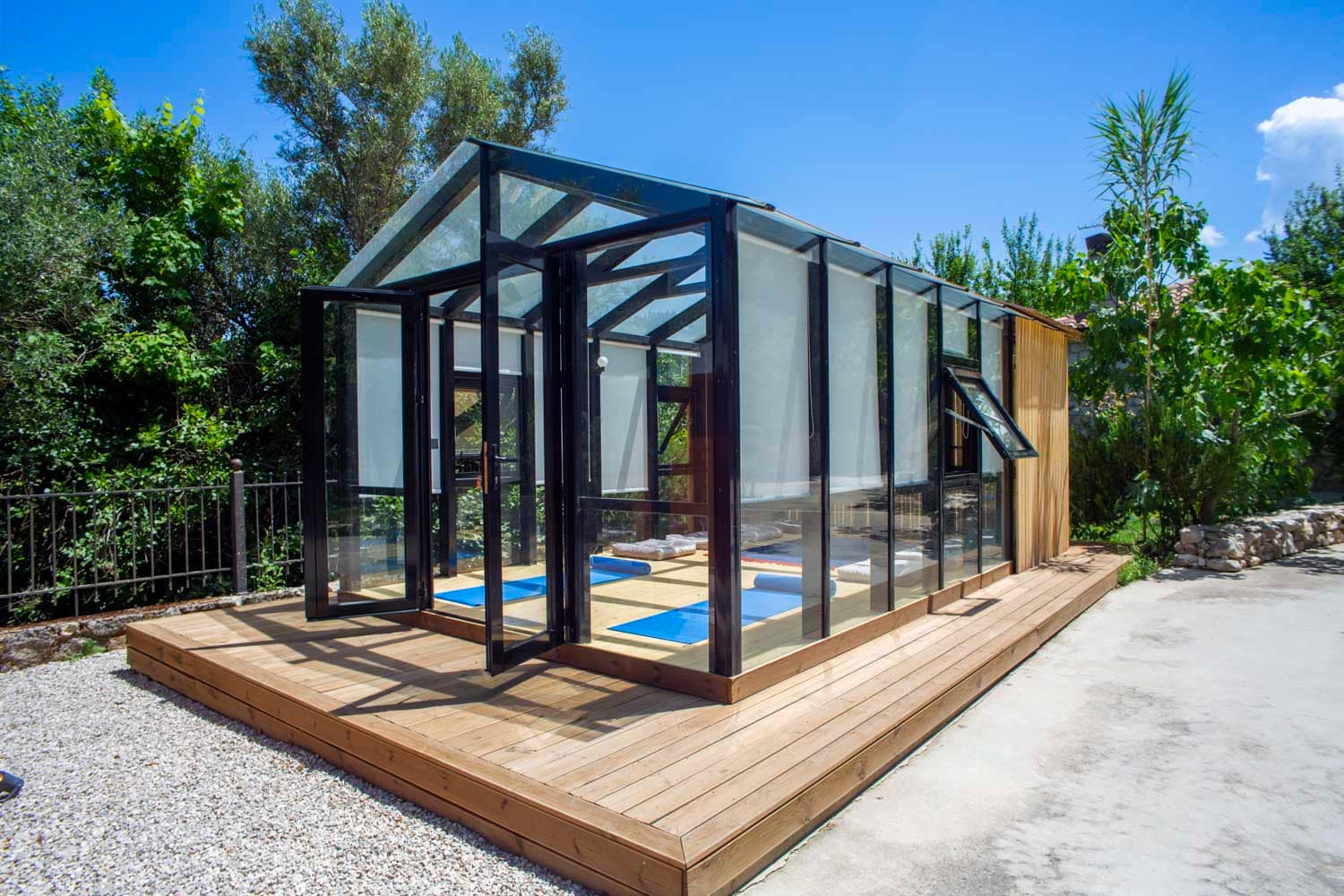 Glass pavilion with yoga mats for mindfulness practices. Free to use for Apanema Mindfulness Villas guests.