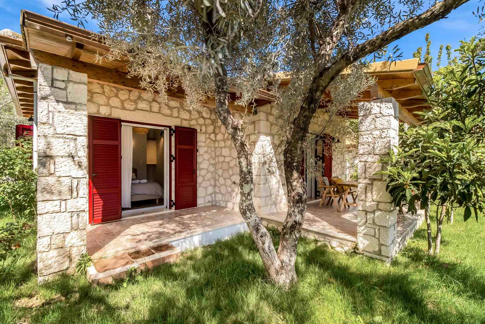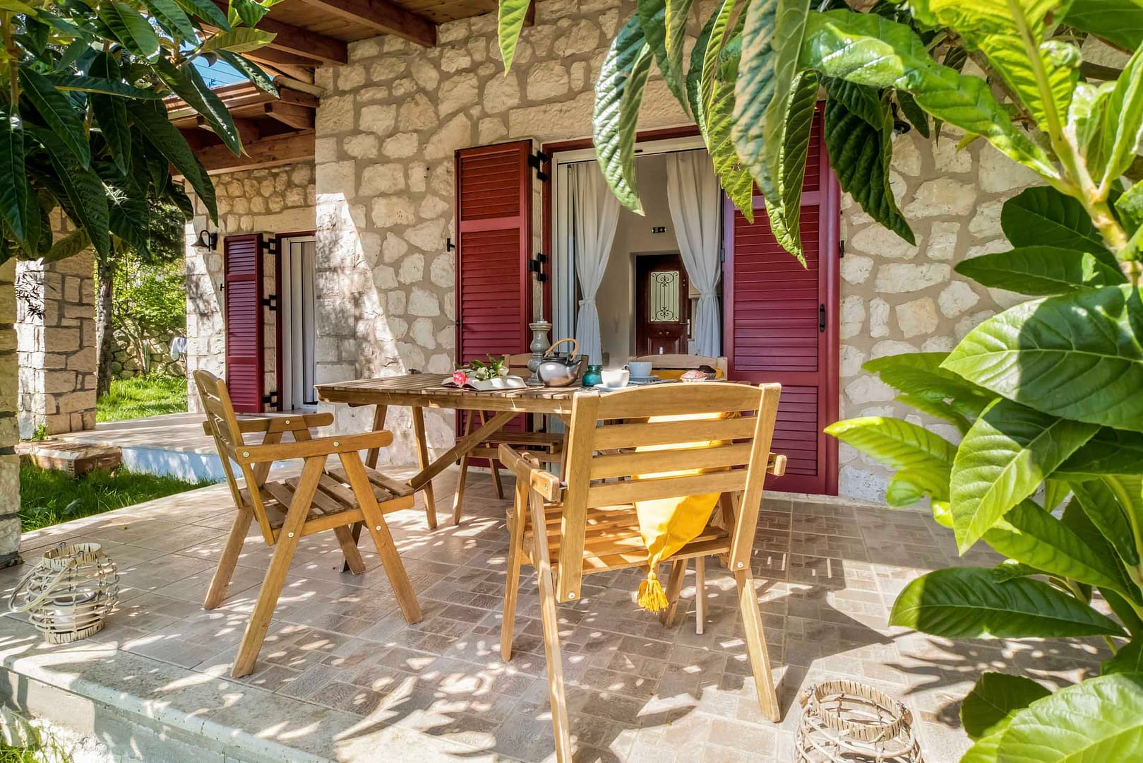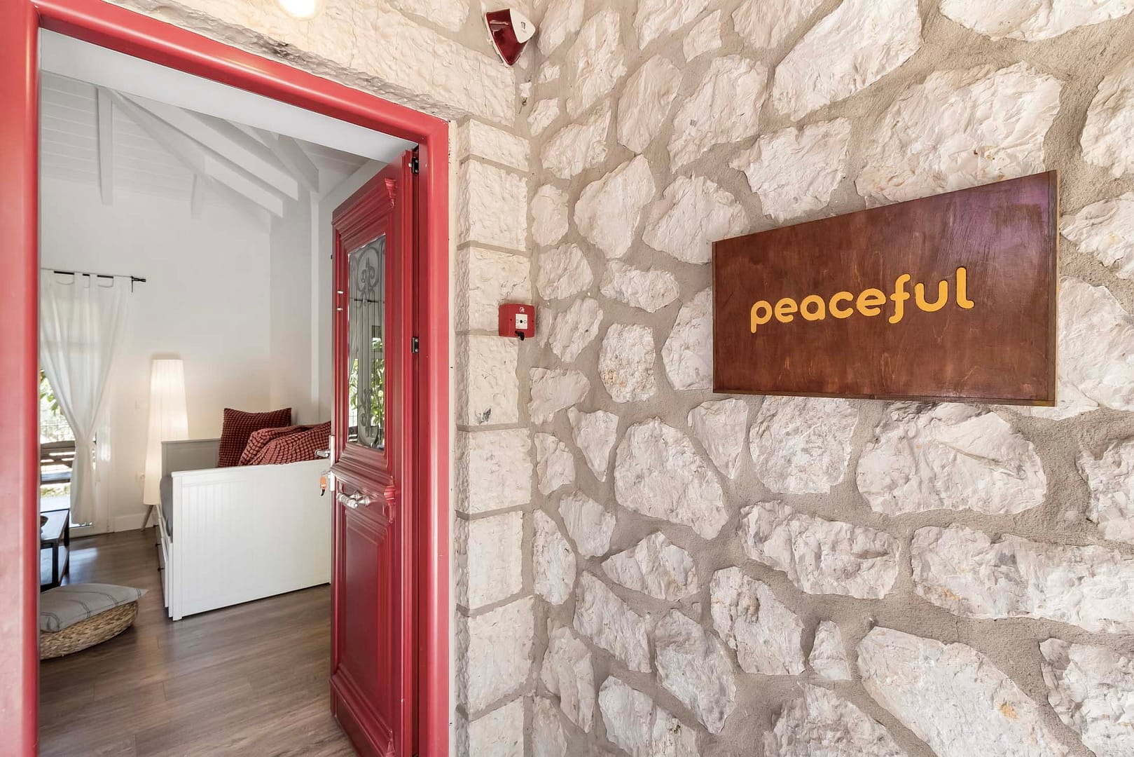 Peaceful Villa (50 sqm) is the first stone house as you walk into Apanema Mindfulness Resort in Lefkada Island, Greece. It is the one with red shutters, you will identify it easily as soon as you enter the gate of our complex.