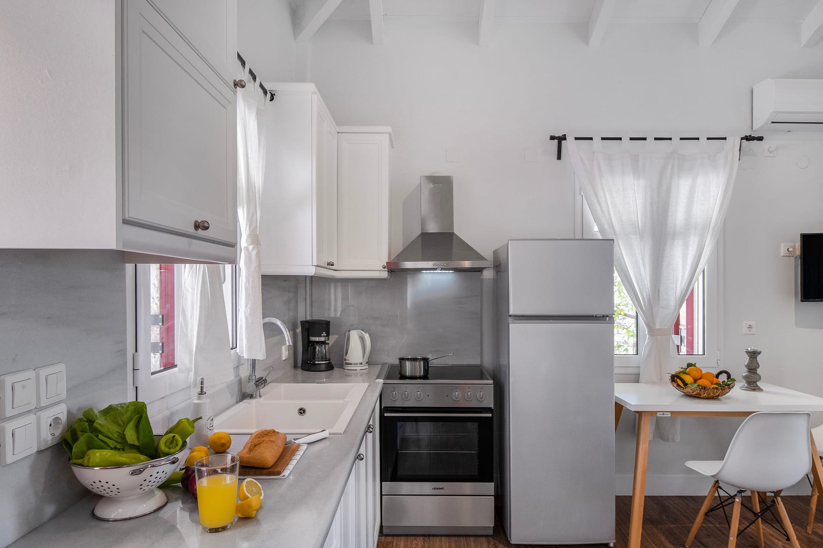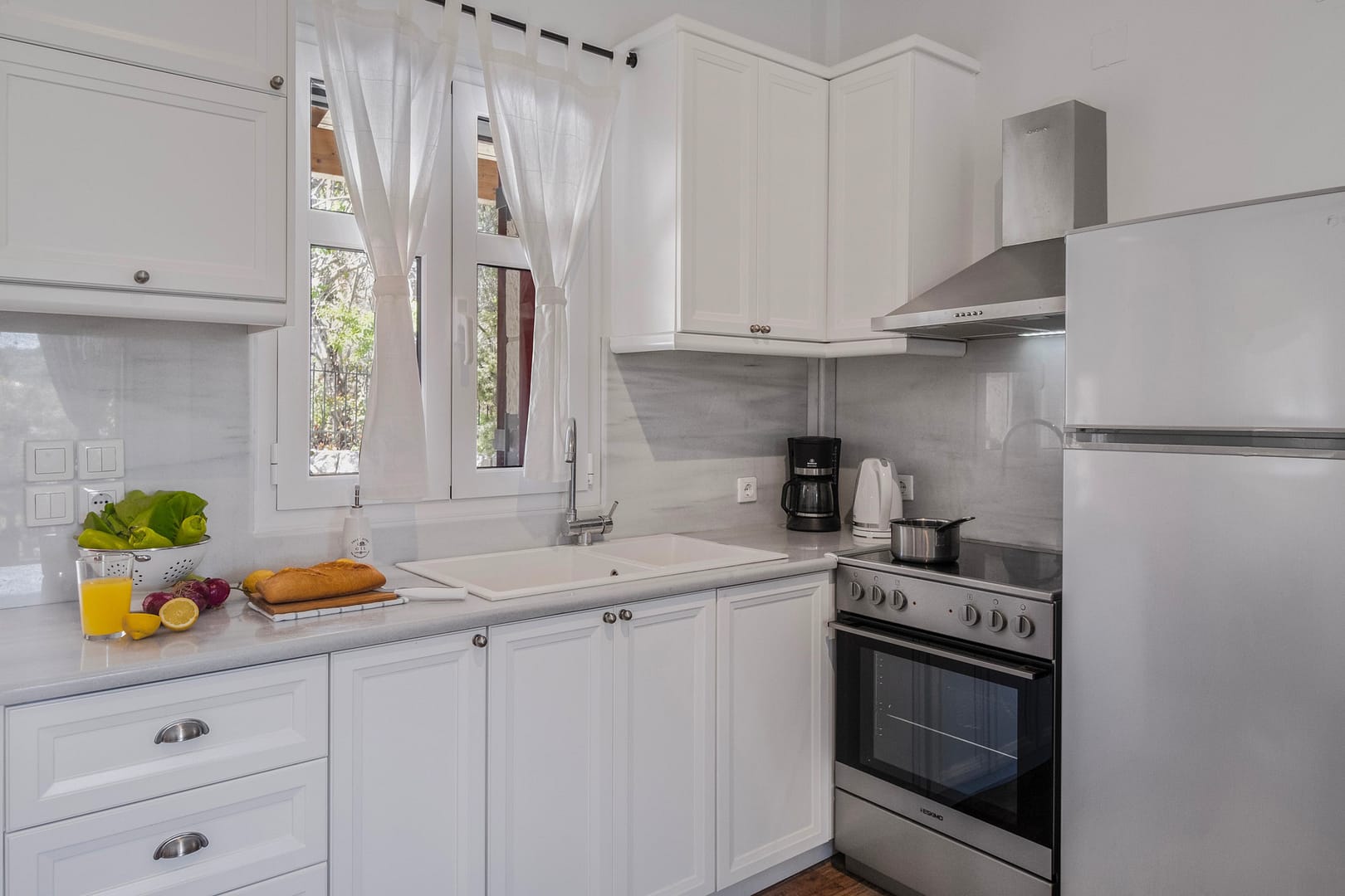 Nespresso type coffee maker, kettle, tea, electric stove top & oven, fridge, freezer, cookware and utensils, salt, pepper, sugar, olive oil - locally produced yearly from the olive trees on the premises.